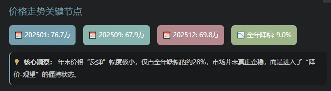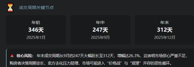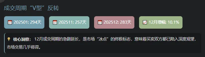 成交周期在也呈现出“V型”波动。这一“V型”反转是市场信心不足的信号。它表明,当价格在年末出现“跳水”时,购房者并未如预期般蜂拥而至,反而因对市场选择“持币观望”,导致房源在市场上的“滞留”时间大幅增加。