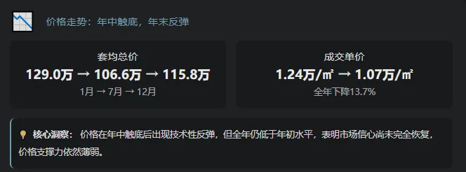 全年套均总价从129万降至106.6万后回升115.8万,成交单价从1.24万/㎡缓降至1.07万/㎡