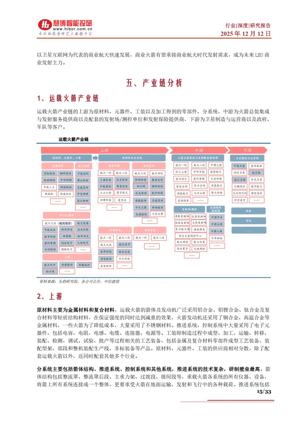 产业链分工清晰,上下游协同发展。上游为金属材料、复合材料、电子元器件等,发动机成本占火箭总成本 30%-50%,是核心环节;中游涵盖火箭总装集成、发射服务及发射场、测控配套,国家队与民营企业共同参与;下游包括卫星制造运营商及政府、军队客户,商业卫星需求占比超 86%。国内已形成 “国家队主导、民营补充” 格局,长征系列火箭承担主力发射任务,蓝箭航天、星河动力等民营企业在液体火箭、可回收技术上实现突破。