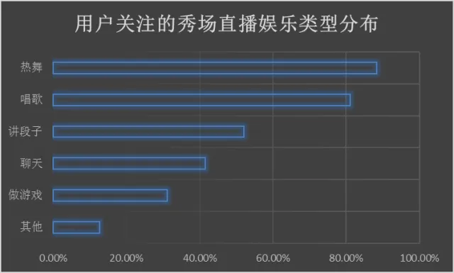 调查结果显示。在秀场直播用户对秀场娱乐模式的关注类型上,热舞、唱歌是用户关注的主要内容,拥有着好身材、好舞姿的女主播们在镜头下摇曳起舞,是大量男性用户买单的目标,也是排解寂寞的不二选择。此外,唱歌、讲段子的女主播们和用户间有较强的互动性,可以吸引大量的用户参与,也是用户喜爱的秀场直播中娱乐模式之一。
