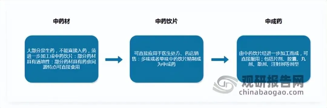 中药饮片是指按中医药理论将中药材经过规范化的中药炮制方法炮制加工、减毒增效后可用于中医临床的中药。中药产业包括三大部分,即中药材、中药饮片和中成药,存在着较为明显的上下游关系。中药材经过种植、采摘、捕获后还需经一系列炮制加工才能成为可熬制汤剂入药的中药饮片。中药饮片可作为药剂配方服用或直接服用,也可以经过进一步加工成为可直接服用的中成药。根据《中国药典》(2015年版)规定,中成药的生产须以中药饮片作为原料,因此,从其在中药产业中所处的位置来看,中药饮片相当于“中药材炮制品”和“中成药原材料”的地位,处于中药产业的中间核心环节,具有承上启下的重要作用。