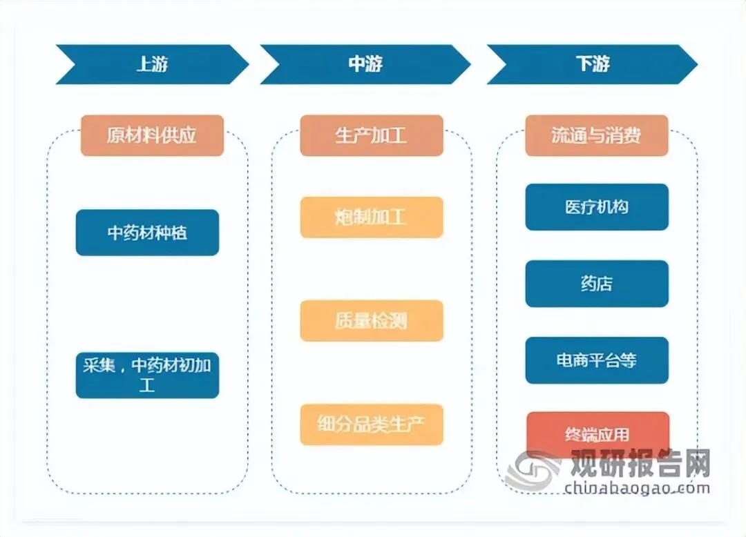 我国中药饮片产业链上游主要为中药材种植、采集以及中药材初加工环节;中游为中药饮片炮制与加工;下游为销售渠道和消费终端,包括医疗机构、药店、电商平台等线下和线上渠道,终端为消费者。