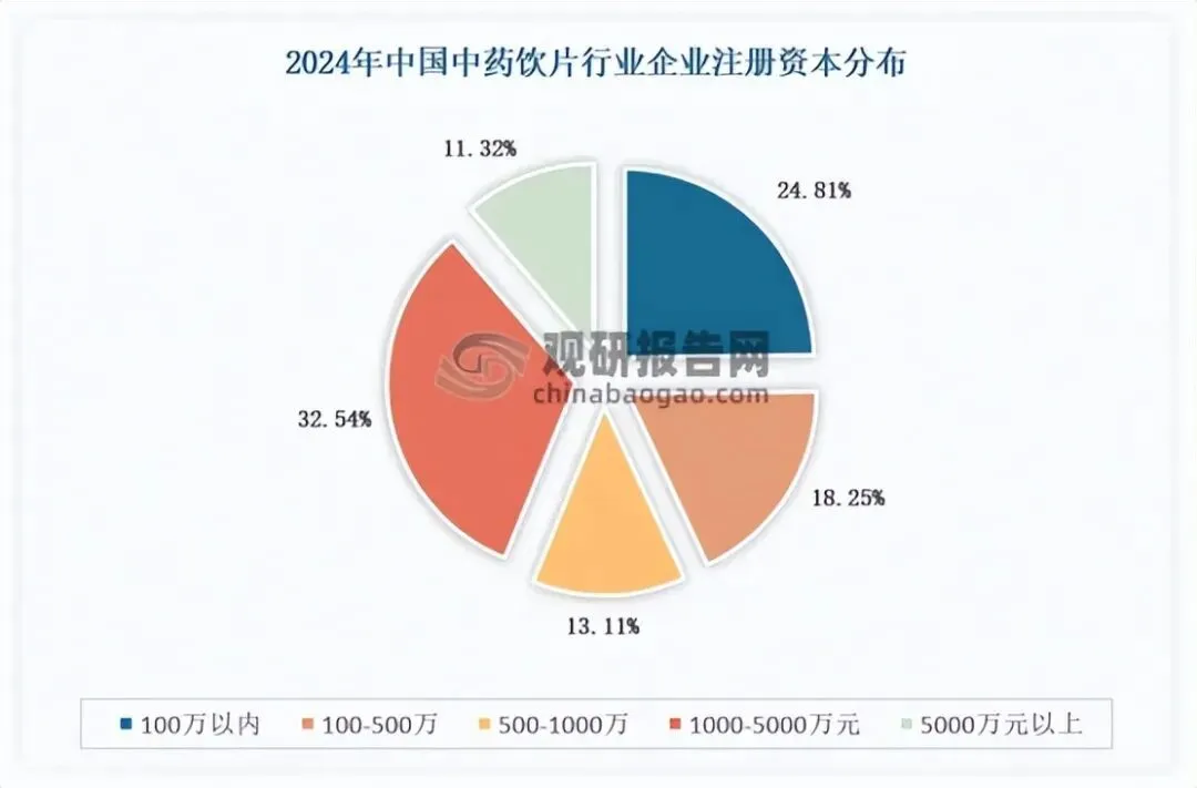 我国中医饮片行业进入壁垒较低,进入该行业的企业规模相对较小。根据企查查数据,我国中医饮片相关企业中,注册资本在100万以内的企业占比仅为24.81%,注册资本在100-500万的企业占比为18.25%,500-1000万的企业占比为13.11%,1000-5000万的企业占比为32.54%,5000万以上的占比为11.32%。具体如下: