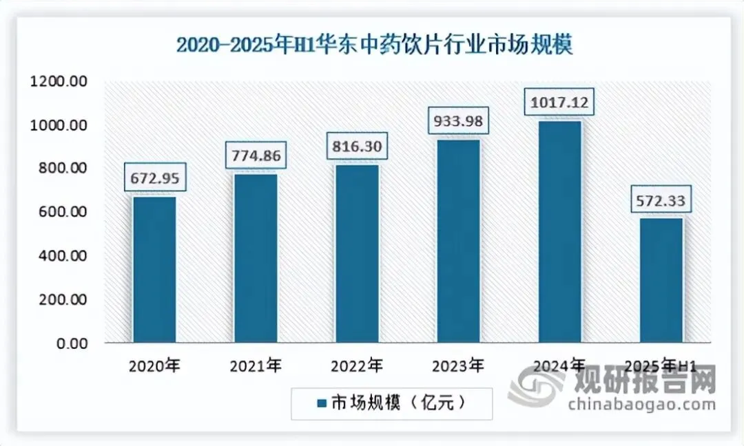 随着我国人口老龄化加剧、慢性病发病率上升,推动中药饮片在养生保健、康复治疗等领域的应用。华东地区作为中国中药饮片市场的核心区域,近年来,市场规模保持稳定增长态势,2020-2024年,市场规模从672.95亿元增长至1017.12亿元,复合增长率为10.88%。