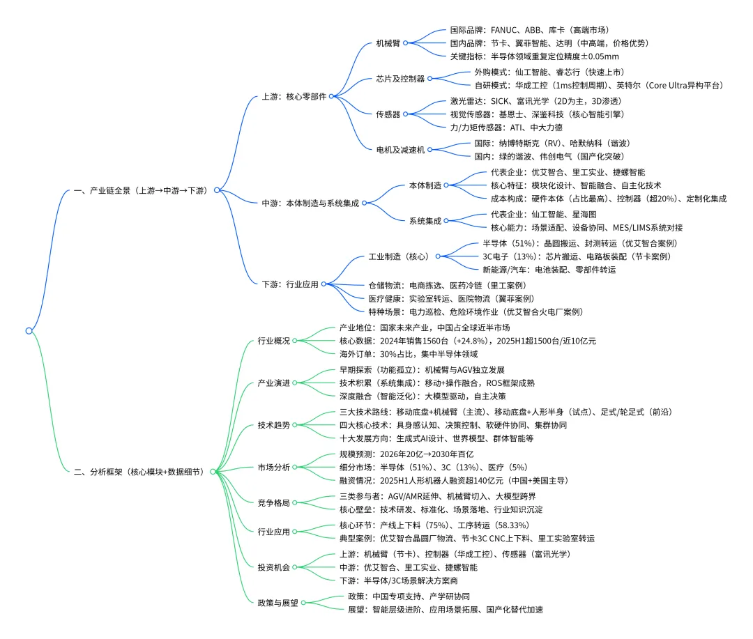本报告基于《具身智能复合移动机器人产业发展蓝皮书(2025版)》核心数据,围绕“行业分析与投资机会”“技术与产业链深度”两大核心目标,全面覆盖产业全维度信息。行业层面,具身智能复合机器人已上升为国家未来产业,2025年上半年中国市场销售超1500台、金额近10亿元,接近2024年全年规模,海外订单占比30%且集中于半导体领域,2030年工业及仓储物流市场规模将突破百亿。投资端,半导体、3C电子、医疗健康等场景需求爆发,技术突破、政策支持、劳动力短缺构成三大驱动,核心投资机会集中于上游核心零部件、中游本体制造及下游场景落地企业。技术与产业链层面,“移动底盘+机械臂”为当前主流形态,“移动底盘+人形半身”加速试点,具身感认知、决策控制等关键技术持续突破;产业链呈现“上游攻坚、中游整合、下游爆发”格局,国内企业在整机集成与场景应用上具备优势,核心零部件国产化替代加速。本报告通过数据拆解与案例分析,为行业认知与投资决策提供全景参考。