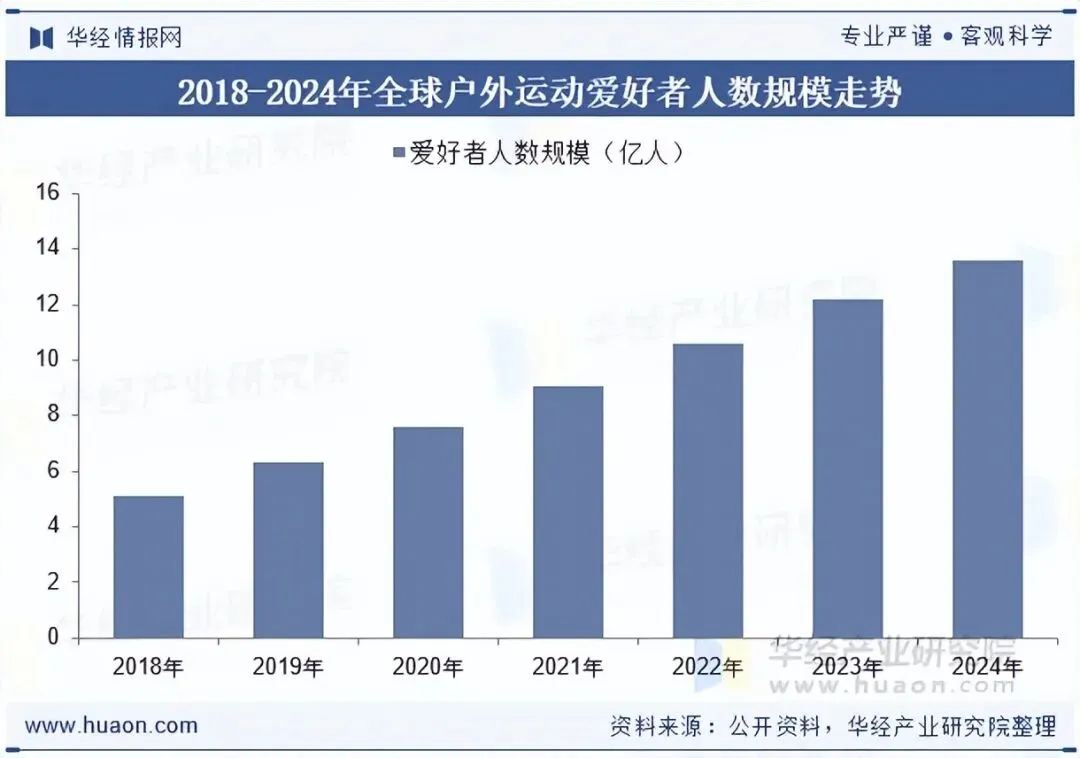 近年来全球户外运动的人数不断增加,对运动装备的需求也在不断增加,这种增长的趋势成为拉动运动服饰行业市场规模增长的动力。据统计,截至2024年全球户外运动爱好者人数增长至13.6亿人,随着各国政府越来越重视国民健康政策和教育,预计未来全球户外运动爱好者人数将持续增长。