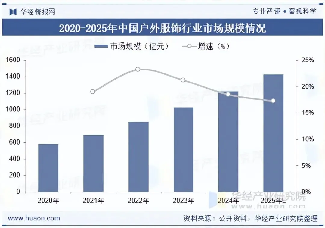 相较于欧美市场超过50%的户外运动渗透率,中国目前的渗透率仍有巨大的提升空间,这预示着市场的广阔前景。特别是在2020年之后,受疫情催化的户外热潮影响,中国户外服饰市场一改此前几年的平缓增长,进入了新一轮的快速增长通道。市场规模从产品销售额、品牌营收等多个维度均呈现出强劲的增长势头。据统计,2024年我国户外服饰行业市场规模达到1220亿元,预计2025年增长至1430亿元。