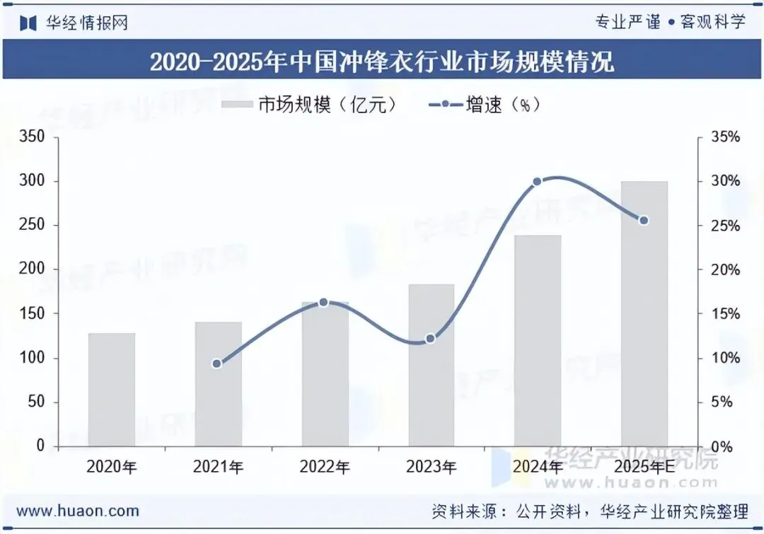 在消费降级的背景下,消费者更加注重性价比,国产冲锋衣裤品牌的需求快速攀升,推动市场大幅增长。据统计,我国冲锋衣行业市场规模从2020年的129亿元增长至2024年的239亿元,2020-2024年CAGR为16.7%,预计2025年我国冲锋衣行业市场规模达到300亿元。