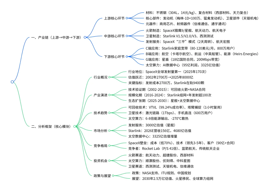本报告围绕商业航天行业展开深度分析,以行业领军者SpaceX为核心案例,全面覆盖行业概况、产业演进、技术趋势、市场空间、产业链结构、竞争格局及投资机会。行业层面,商业航天已进入规模化复苏期,SpaceX凭借可复用火箭技术、Starlink星座组网及太空数据中心布局,构建起“发射服务+卫星互联+太空算力”的三位一体业务体系,估值从2002年2700万美元跃升至2025年8000亿美元,带动全球航天经济重构。投资逻辑上,技术突破(可复用、低成本)、需求爆发(AI算力、全球互联)、政策支持构成三大核心驱动,火箭制造、卫星组网、太空算力三大赛道孕育明确投资机会。技术与产业链层面,可回收火箭、激光星间链路、太空极端环境利用等技术路径主导行业演进,上游材料/核心部件、中游制造/发射、下游应用/运营的产业链分工明确,国内外相关企业已形成差异化竞争格局。