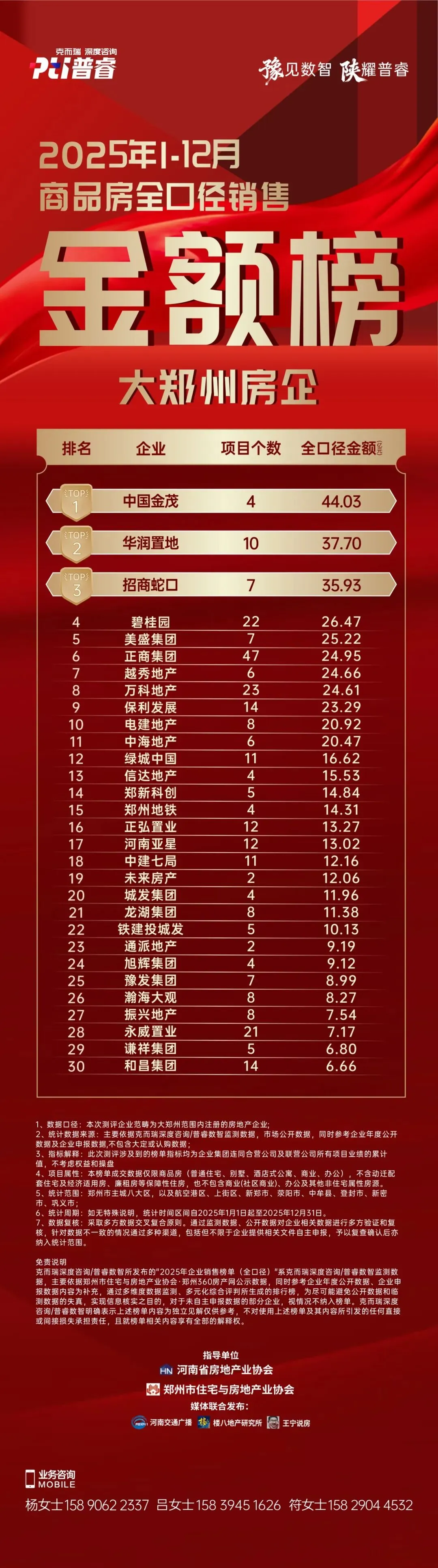 中国金茂(约44.03亿元),华润置地(约37.70亿元),招商蛇口(约35.93亿元)摘得全口径销售金额榜单前三名。郑州2025年度项目商品房全口径销售排行榜: