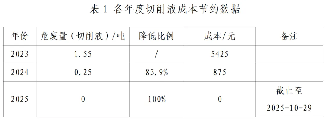 3.通过设备迭代升级,推进智能制造转型。企业累计投入60余万元引进自动化设备、工业机器人(含3台桁架、1台工业机器人),实现关键工序自动化覆盖,生产效率提高约20%-30%;其中,引进自动液压弯管机,在提高工作效率的同时,弯管质量不良率消除至零;引进除尘净化设备,切削液重复利用,既节约了成本,又解决了环保问题,与2023年相比,成本节约5425元,切削液危废量由1.55吨降低至0吨,详见表1。
