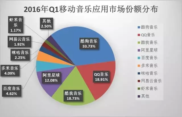 2016年第一季度主流移动音乐应用月均在线时长依次排名为:酷我音乐、酷狗音乐、网易云音乐、QQ音乐、虾米音乐、百度音乐、咪咕音乐、多米音乐、阿里星球。从在线时长上看,海洋音乐与网易云音乐有较为强势领先的姿态。