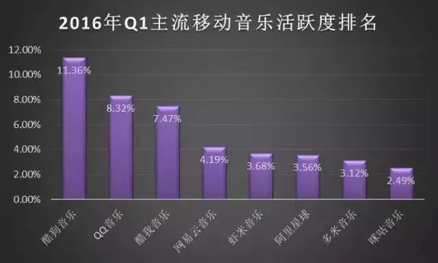 从2016年第一季度主流音乐活跃度排名可以看出,酷狗音乐活跃度排在第一位,活跃度达到11.36%;QQ音乐排在第二位,活跃度为8.32%;酷我音乐活跃度为7.47%,排在第三位;网易云音乐活跃度4.19%,排在第四位;虾米音乐、阿里星球、多米音乐、咪咕音乐活跃度分别为3.68%、3.56%、3.12%、2.49%。