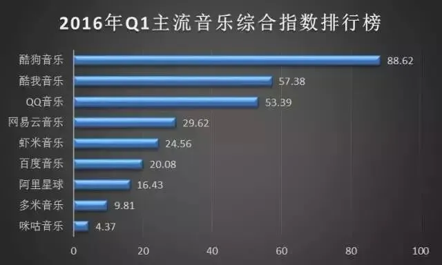 根据统计的综合数据显示,在移动音乐综合指数排行榜中,酷狗音乐以88.62分的成绩遥遥领先,酷我音乐、QQ音乐分别排在第二和第三的位置。行业逐渐开始两极分化,拉开距离,海洋音乐与QQ音乐所构成的第一梯队,逐渐开始加快步伐,进一步拉开距离。海洋音乐、腾讯音乐与网易云音乐进一步达成共识,形成版权资源互授权,进一步与阿里音乐形成对峙局面。