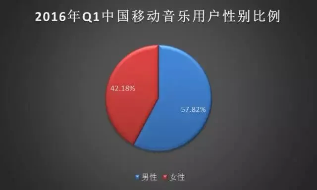 通过2016年Q1中国移动音乐用户性别占比可以看出,男性占比仍未主流达到57.82%,女性占比仅为42.18%。与移动互联网用户性别分布进行对比可以看出,移动音乐用户女性占比明显较高。并且用过付费率调查发现,女性用户较男性更容易付费,所以移动音乐市场针对女性群体展开的音乐项目,更具备成长潜力。