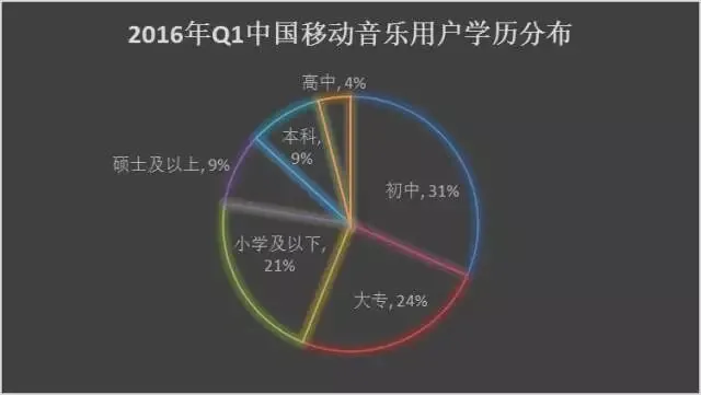 2016年第一季度十大移动音乐用户学历分布可以看出,初中学历占比达到31%;大专学历达到24%;小学及以下的占比也由21%;反而本科以上学历的用户仅为18%;但高中学历用户却是仅为4%。