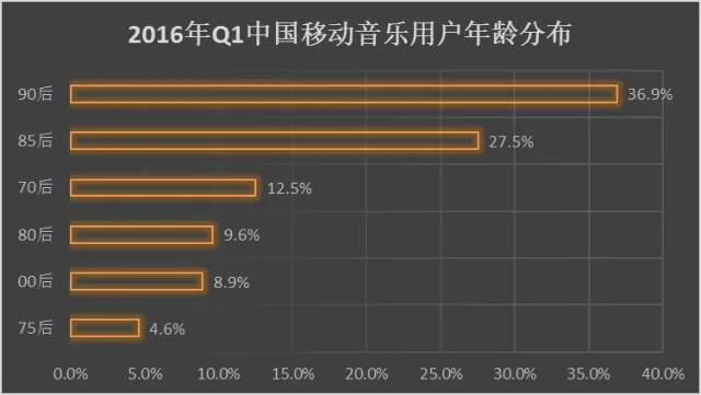 从移动音乐用户的年龄机构可以看出,90后、85后已经成为音乐用户的主体,整体占比超六成。由于工作压力不断的增加,70后与80后逐渐成为社会的支柱,其娱乐活动相对减少,使得其占比逐渐下滑。反而从分布中首次看到00后的身影,其最大岁数已经达到16岁,正是空闲时间较多的阶段,未来将成为市场主要的增长潜力。