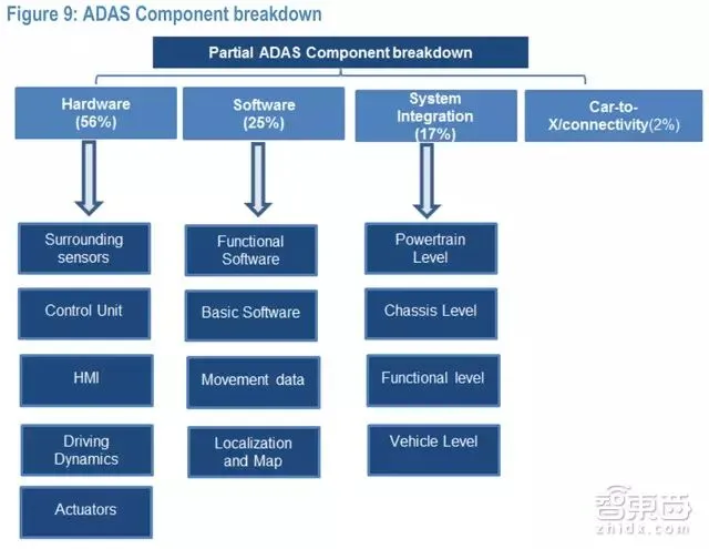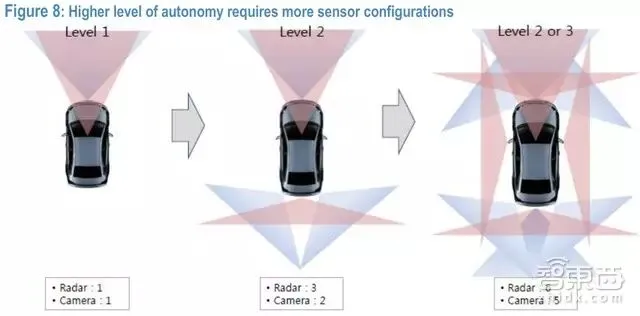 ADAS型智能汽车的主要部件包括传感器(雷达、摄像头等)、电力控制单元、制动器等。越高阶的自动驾驶汽车需要的传感器就越多。