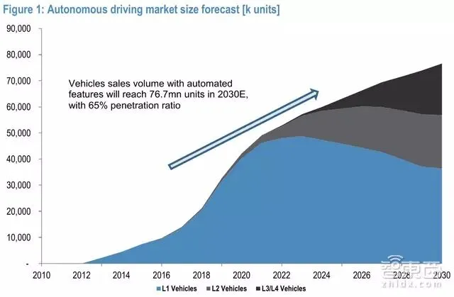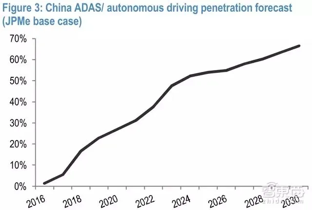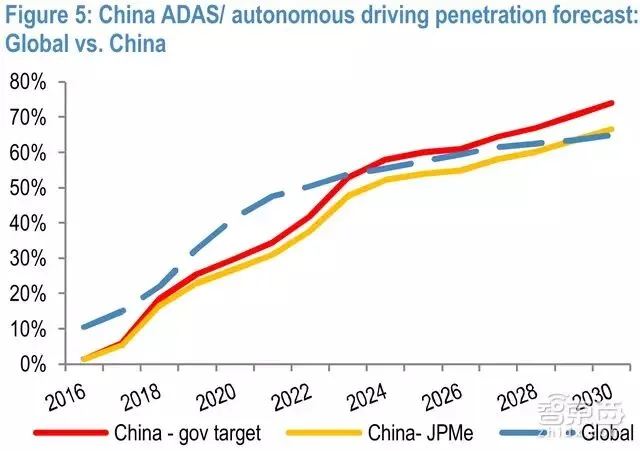 根据国务院提出的中国智能汽车发展目标,在2030年,智能汽车,包括高级辅助驾驶系统(ADAS)和全自动驾驶市场,将达到75%的市场渗透率,而全球预计市场渗透预计为65%。