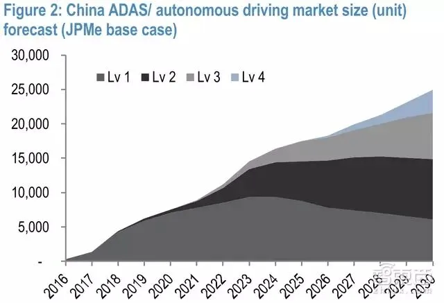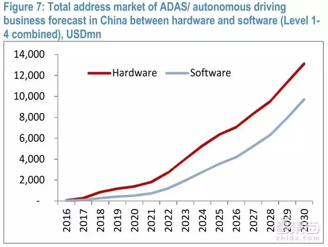 摩根大通认为,下个十年内,中国汽车市场的主要营收(月60%-70%)来自于硬件,也就是传感器、制动器等;其余则为软件,包括地图、定位等服务。值得注意的是,软件发展增速将超过硬件,预计截至2025年年复合增长率达80%,2030年年复合增长率约55%。