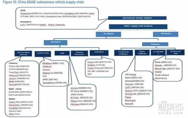 对此,摩根大通整理出了中国智能汽车产业链地图,包括汽车零部件、中控系统等,并盘点了23位主要玩家: