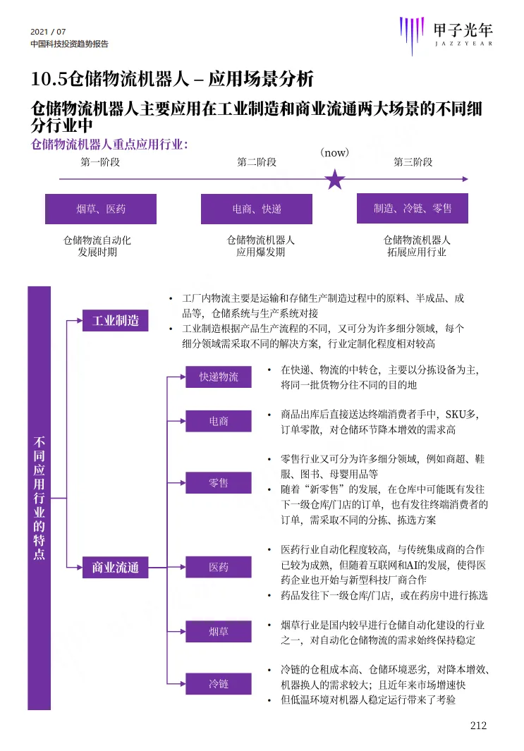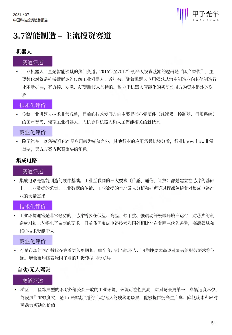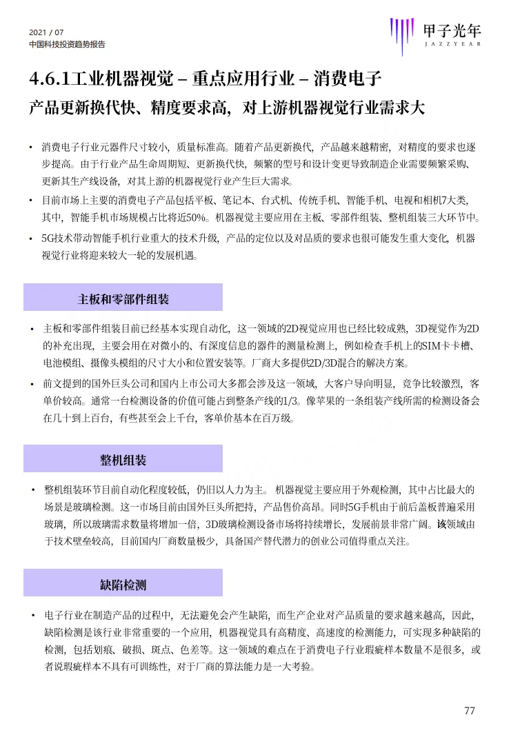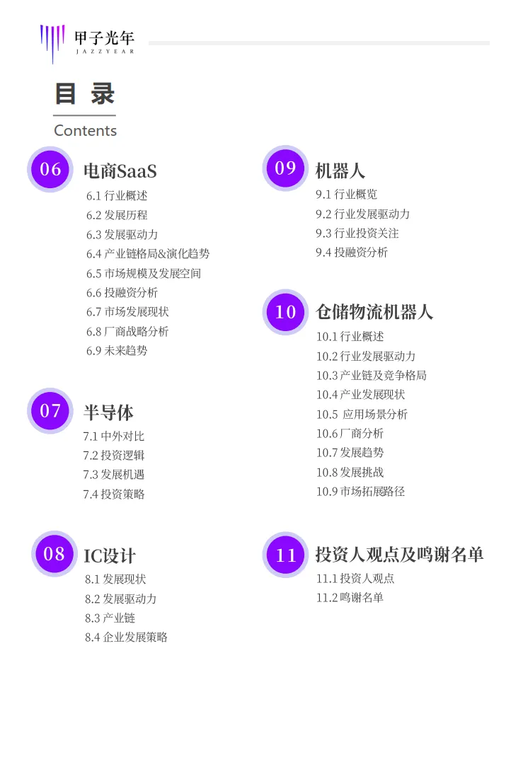 该部分选择了智能制造、工业机器视觉、云计算、电商SaaS、半导体、IC设计、机器人、仓储物流机器人等八个细分行业进行了研究分析,每个行业从发展历程、产业链、市场规模、竞争格局、投融资、重点细分应用行业、行业发展关键要素、未来趋势等角度进行全面分析。