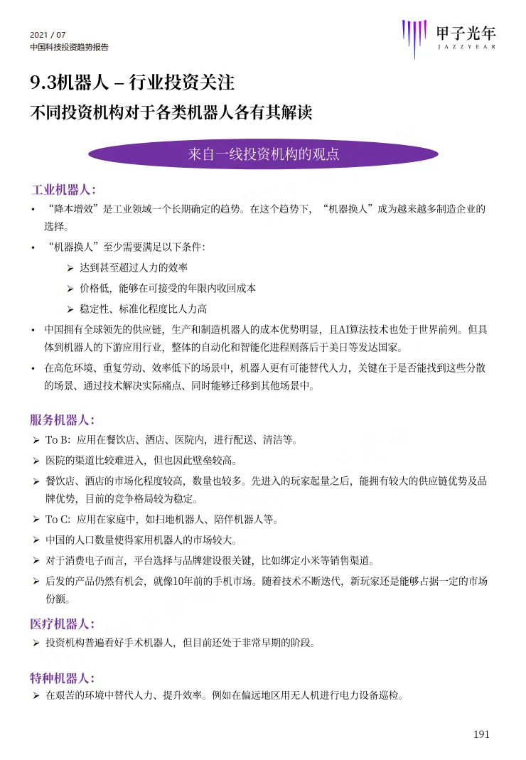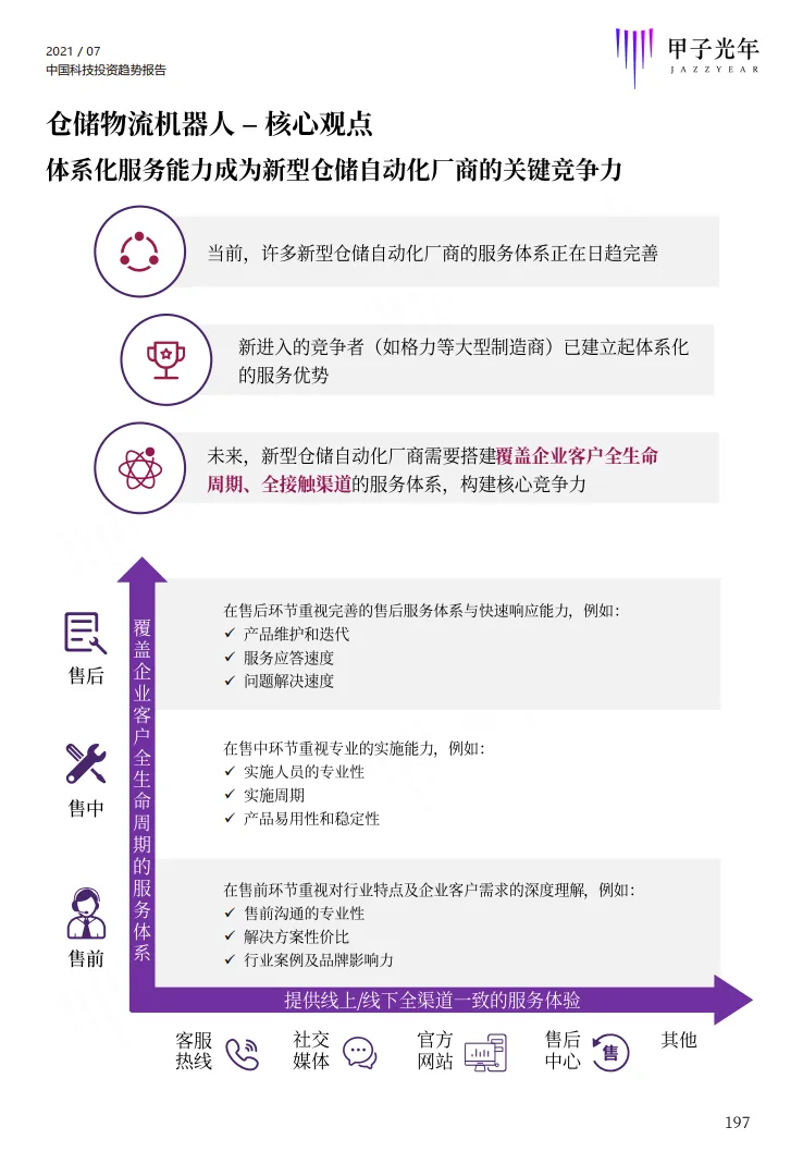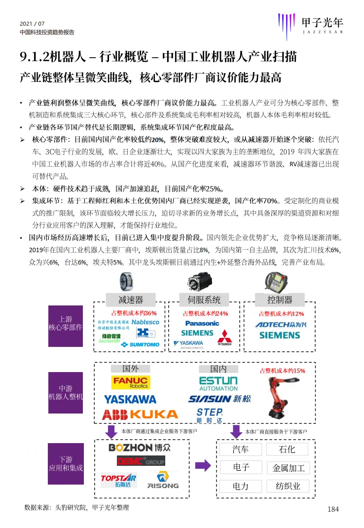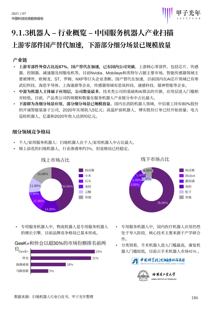 该部分选择了智能制造、工业机器视觉、云计算、电商SaaS、半导体、IC设计、机器人、仓储物流机器人等八个细分行业进行了研究分析,每个行业从发展历程、产业链、市场规模、竞争格局、投融资、重点细分应用行业、行业发展关键要素、未来趋势等角度进行全面分析。