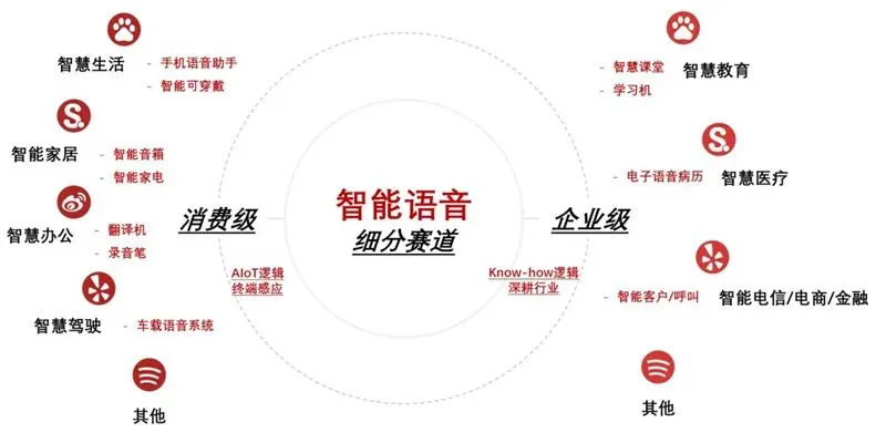 智能语音2C消费级 & 2B企业级市场各细分赛道均有广阔空间,后疫情时代有望全面开花,梳理如下图。