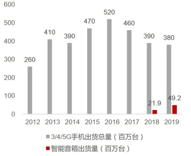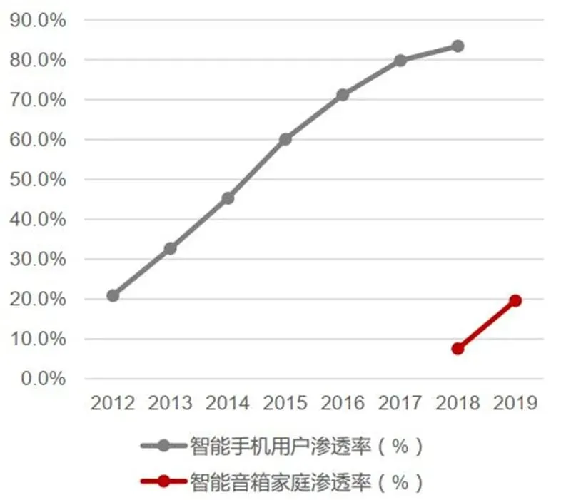 智能音箱为语音交互蓝图铺路,是智能家居入口。早在2019年底,中国智能音箱累计出货量就已经超过7000万台,在我国城镇住房中渗透率达到20%,接近2012年智能手机的渗透程度。