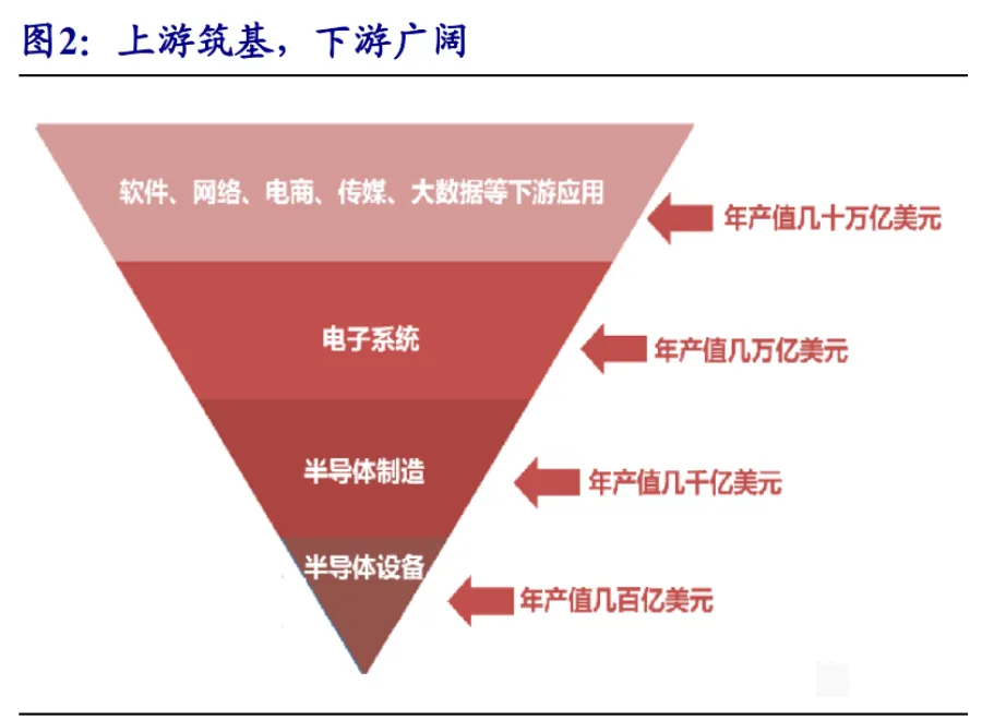 在半导体产业链中,上游由 EDA、材料、设备三大行业构成,中游由芯片设计、制 造、封测三大环节构成,下游由集成电路、分立器件、光电子、传感器四大品类构成。从市场规模来看,全球半导体行业由几百亿美元市场规模的半导体设备、材料行业 为基石,延展成市场规模达几十万亿美元的巨大应用市场。