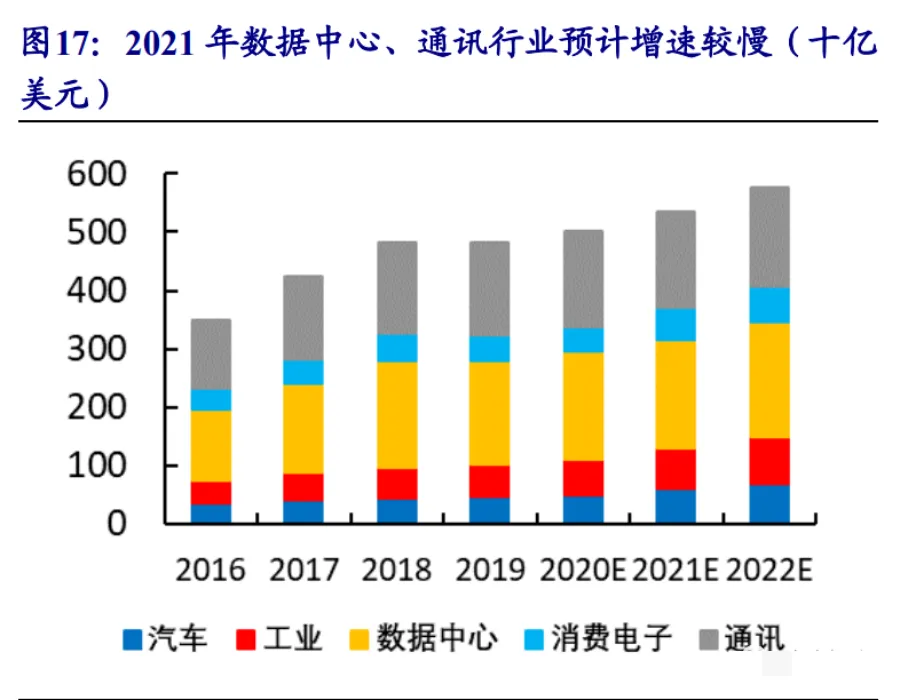 2021 年汽车、工业预将增速加快,2022 年数据中心预将迎来高速增长期:根据 PWC 预测,在 2021 年,汽车和工业领域市场扩张速度将显著加快、分别达 18%和 16%, 而历经 2020 年高速增长期的通讯领域市场扩张速度将显著放缓、仅 0.6%,与之相反,受疫情影响 2020 年有所萎缩的消费电子领域扩张速度将明显回暖、达 26%。作为持续扩张的优质赛道,叠加疫情催动下在家办公需求提升,根据 PWC 预测,2020 年数字中心赛道扩张速度将达 4.0%,而 2021 年该市场增速将放缓至 1.1%,不过, 2022 年数据中心市场扩张速度将达 7.0%,即 2021H2 或将迎来数字中心产业链厂商 的基本面拐点。