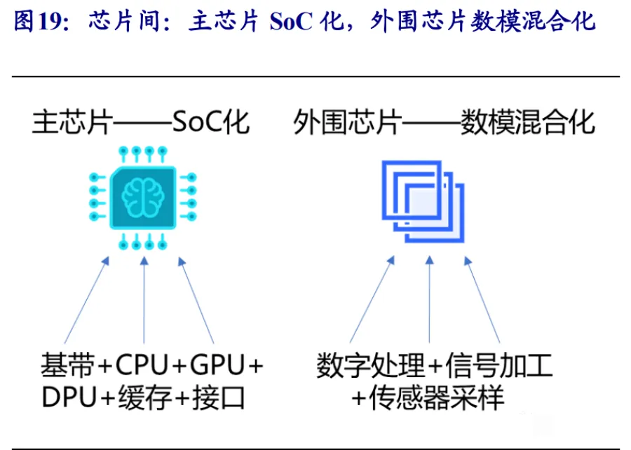 SoC 趋势持续演化,模数混合成为前进方向:由于物联网产品的体积较小且对连接 模块需求较高,随着新兴产品的持续放量,主芯片的 SoC 化预将愈发显著。随着摄 像头模组、声学模组和电源管理模块等功能模块的日益复杂化,叠加主芯片内核数 量及制程推进均陷入瓶颈期,一方面外围芯片需要更强的算力和更低的信息耗损, 另一方面有限线程的主芯片需要信号被预处理,那么,外围模块的信息处理能力和 “传感器+模拟芯片+数字芯片”的整合便愈发重要。