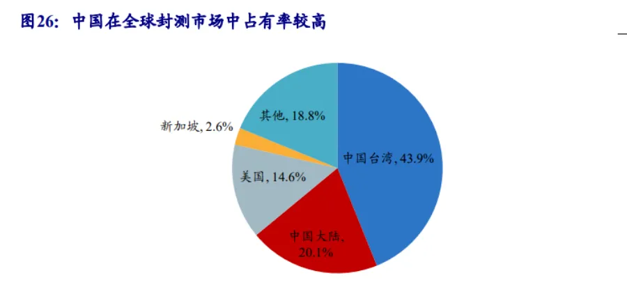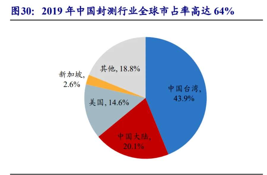封测行业在全球集成电路产业链占比较小,中国地区占据大部分市场份额。2019 年全球集成电路产业结构中,封装环节占比最小仅为 16%。根据 CSIA 统计,2019 年 中国大陆在全球封测市场的销售占比为 20%,拥有较大的市场份额。