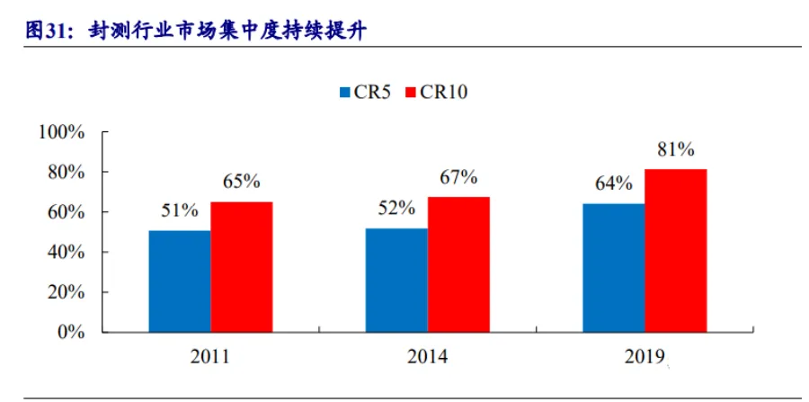 近年封测行业并购频发,市场集中度持续提升,大陆封测厂也通过并购迅速提 升自身技术实力和市场规模。封测行业资本投入、进入壁垒、集中度介于 IC 设计和制造环节之间,同类企业间无较大技术差别,封测厂商初期竞争十分激烈,在竞争和 成本的双重压力下,头部企业通过并购实现规模扩张,从而提高自身集中度。国外企 业如力成科技收购 Micron Akita,日月光收购矽品精密,安靠收购欧洲封测龙头 Nanium。全球封测行业 CR5 由 2011 年的 51%提升至 2019 年的 64%,CR10 则由 2011 年的 65%提升至 2019 年的 81%。