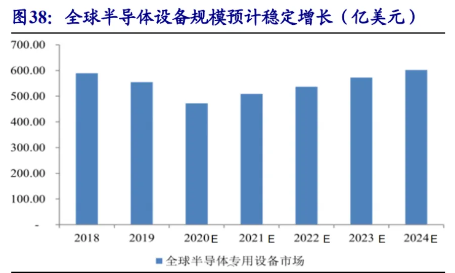 半导体专用设备行业与半导体行业整体景气程度密切相关,也保持稳定增长态势,但半导体行业整体景气度降低,2019 年全球半导体设备行业也受到一定冲击。2019 年全球半导体设备销售额为 597.5 亿美元,较 2018 年下降了 7.4%。芯片制造 设备是半导体专用设备行业需求最大的领域。根据 Gartner 统计数据,2019 年全球 芯片制造厂商设备支出为 554.80 亿美元,预计 2021 年全球半导体设备行业开始复 苏,2024 年将增长至 602.14 亿美元,2020 年-2024 年 CAGR 为 6.27%。