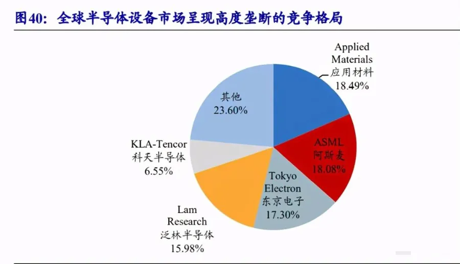 半导体设备市场集中度较高。2018 年,行业前三家 AMAT、ASML、Lam Research 的市场份额合计约占 50%,前五家 AMAT、ASML、Lam Research、TEL、KLA 市 占率合计为 71%。
