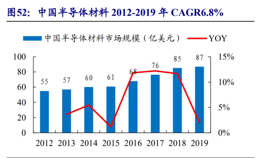 全球半导体材料市场规模稳定增长,中国半导体材料 2012-2019 年 CAGR6.8%。2018 年全球半导体材料销售额 519.4 亿美元,同比增长 11%。在半导体国内市场规 模逐年增加的背景下,半导体材料行业发展迅猛,中国半导体材料销售额逐年增加, 由 2012 年的 55 亿美元增加为 2019 年 87 亿美元。