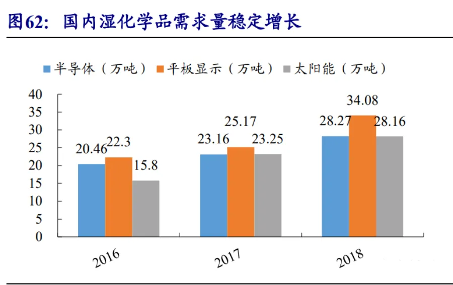 随着国内半导体行业、平板显示行业以及太阳能行业的快速发展,国内湿电子 化学品市场规模逐渐扩大。2018 年国内湿电子化学品市场规模达 79.62 亿元,同比 增长 4.1%,2012 至 2018 年 CAGR 约为 14.8%。从下游领域需求细分情况来看,2018 年半导体行业湿电子化学品需求量为 28.27 万吨,平板显示行业需求量为 34.08 万 吨,太阳能行业需求量为 28.16 万吨,相比 2017 年都有所增加,特别是平板显示行 业,需求增加明显。