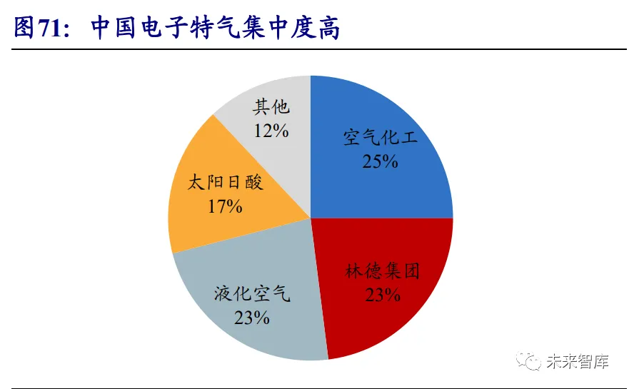 较高的壁垒导致全球竞争格局高度集中。全球工业气体市场经过百余年的发展 和并购,已形成寡头垄断的竞争格局,少数几家气体生产企业占据了全球绝大多数 的市场份额。2018 年,前四大厂商中的德国林德集团与美国普莱克斯集团完成对等 合并成为全球最大的工业气体供应商。在 2018 年全球电子特种气体市场中,美国空 气化工、林德集团、法国液化空气和日本大阳日酸控制着全球 90%以上的市场份额, 形成寡头垄断局面。