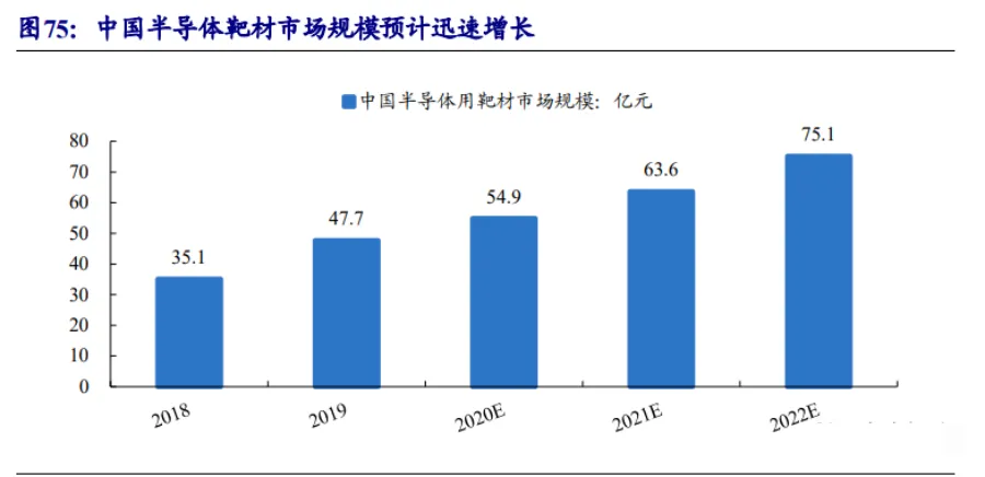 中国半导体靶材市场增长迅速,预计未来仍将快速增长。据智研咨询数据,中 国半导体靶材市场规模 2019 年达 47.7 亿元,同比增长 35.9%。随着智能手机、平板 电脑、汽车电子等终端消费领域对半导体需求的持续增长,尤其是消费电子产品与 互联网、移动互联网的紧密结合,导致手机、平板电脑、智能电视等网络接入终端产 品的应用面持续扩大,预计全球半导体市场在未来将保持持续增长的态势。芯片产 业是大数据、云计算、互联网的基础产业。这些产业的迅猛发展为芯片带来了强劲的 市场需求。由于半导体行业所需溅射靶材品种繁多,且每一种需求量都较大,稳定的 下游市场增速将有力地促进溅射靶材销售规模的扩大,据智研咨询数据,中国半导体靶材市场规模 2022 年预计达 75.1 亿元。