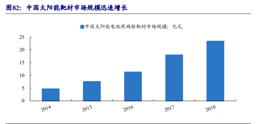 太阳能光伏产业的快速发展给太阳能电池用溅射靶材市场带来了巨大的成长空 间,预计太阳能电池用溅射靶材市场未来仍有望高速增长。现今制备太阳能电池较 为常用的溅射靶材包括铝靶、铜靶、钼靶、铬靶以及 ITO 靶、AZO 靶(氧化铝锌, AluminumZincOxide)等,纯度要求一般在 99.99%以上,其中,铝靶、铜靶用于导电 层薄膜,钼靶、铬靶用于阻挡层薄膜,ITO 靶、AZO 靶用于透明导电层薄膜。据智 研咨询数据显示,2014 年-2018 年我国太阳能电池用溅射靶材市场规模从 4.6 亿元增 至 23.3 亿元,每年增速维持在 30%以上。未来伴随光伏行业的增长以及薄膜电池产 量的提升,太阳能用溅射靶材也有望保持较高速度的增长。