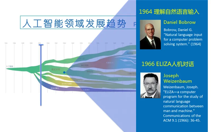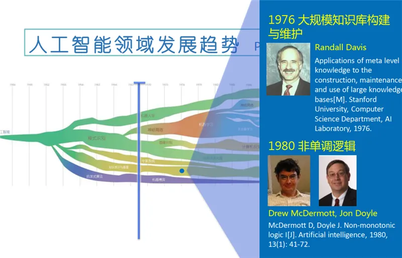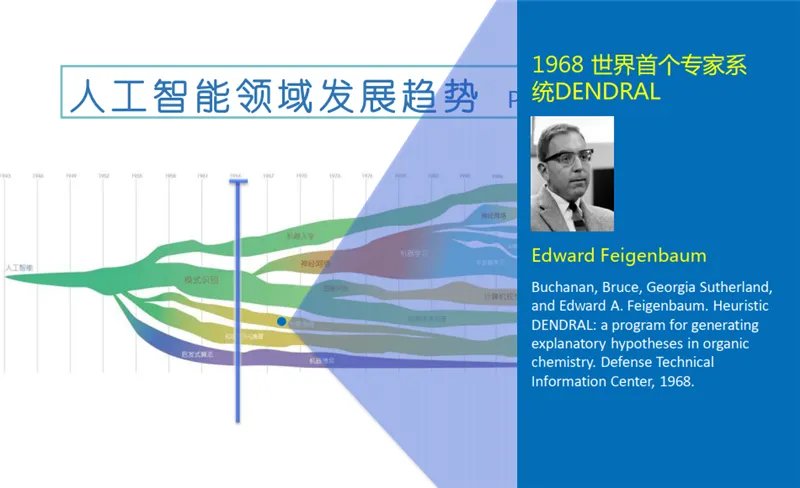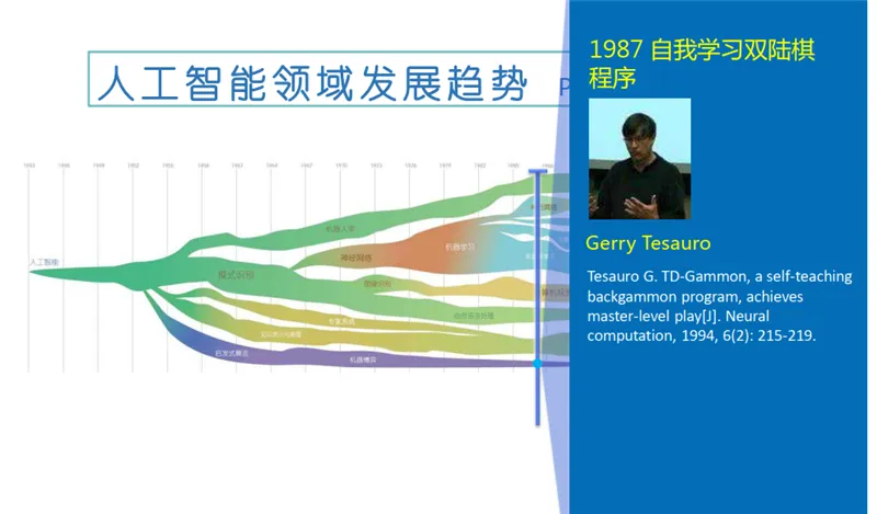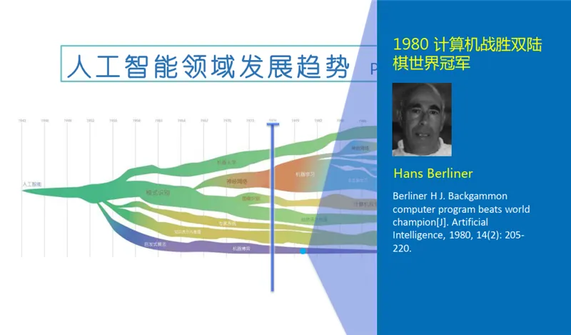 随着克劳德·香农(Claude Shannon)在 1950 年提出计算机博弈,以及阿兰·图灵(Alan Turing)在 1954 年提出“图灵测试”,人工智能这一概念开始进入人们的视野。到了 20 世纪 60 年代,人工智能出现了第一波高潮,发展出了自然语言处理和人机对话技术。其中的代表性事件是丹尼尔·博布罗(Daniel Bobrow)在 1964 年发表的Natural language input for a computer problem solving system,以及约瑟夫·维森鲍姆 (Joseph Weizenbaum) 在 1966 年发表的 ELIZA—a computer program for the study of natural language communication between man and machine。此外,还有一个重要的发展——知识库。1968 年,爱德华·费根鲍姆 (Edward Feigenbaum)提出首个专家系统 DENDRAL 的时候对知识库给出了初步的定义,其中隐含了第二波人工智能浪潮兴起的契机。20 世纪 80 年代,人工智能进入了第二波浪潮,这其中代表性的工作是 1976 年兰德尔·戴维斯 (Randall Davis)构建和维护的大规模的知识库,1980 年德鲁·麦狄蒙(Drew McDermott)和乔恩·多伊尔(Jon Doyle)提出的非单调逻辑,以及后期出现的机器人系统。在 1980 年,汉斯·贝利纳 (Hans Berliner)打造的计算机战胜双陆棋世界冠军成为标志性事件。随后,基于行为的机器人学在罗德尼·布鲁克斯 (Rodney Brooks)的推动下快速发展,成为人工智能一个重要的发展分支。这其中格瑞·特索罗(Gerry Tesauro)等人打造的自我学习双陆棋程序为后来的增强学习的发展奠定了基础。20 世纪 90 年代,AI 出现了两个很重要的发展:第一项内容是蒂姆·伯纳斯·李(Tim Berners-Lee)在 1998 年提出的语义互联网路线图,即以语义为基础的知识网或知识表达。后来又出现了 OWL 语言和其他一些相关知识描述语言。第二项内容是杰弗里·辛顿(Geoffrey Hinton)等人提出的深度学习,这标志着第三次人工智能浪潮的兴起。在这次浪潮中,我们也看到很多企业参与其中,如塞巴斯蒂安·特龙(Sebastian Thrun)在谷歌主导推出的自动驾驶汽车,IBM 的沃森(Watson)于 2011 年在《危险边缘》(Jeopardy)中获得冠军,苹果在 2011 年推出的自然语言问答工具 Siri 等。以上就是人工智能在 60 多年的发展历史中取得的一些标志性成果和技术。
