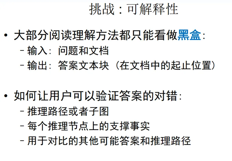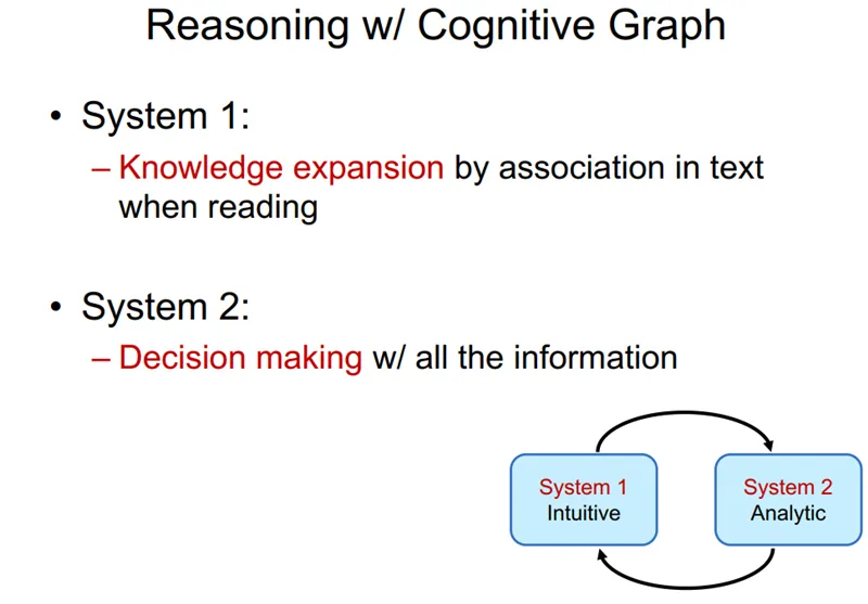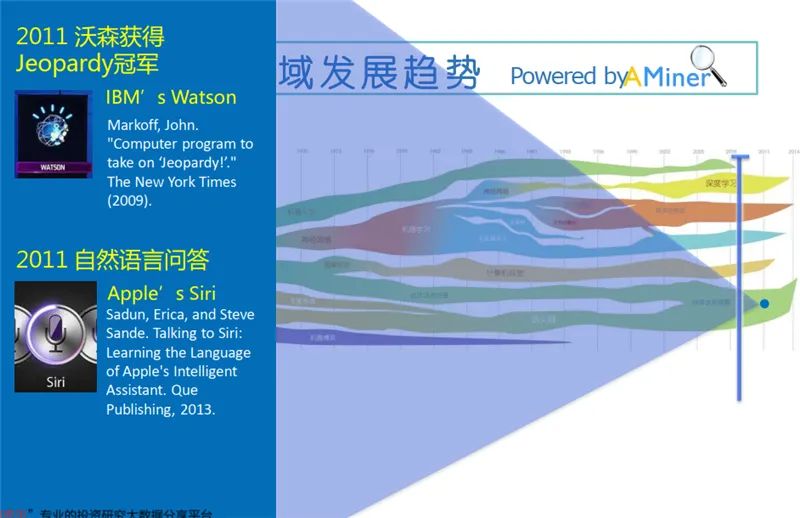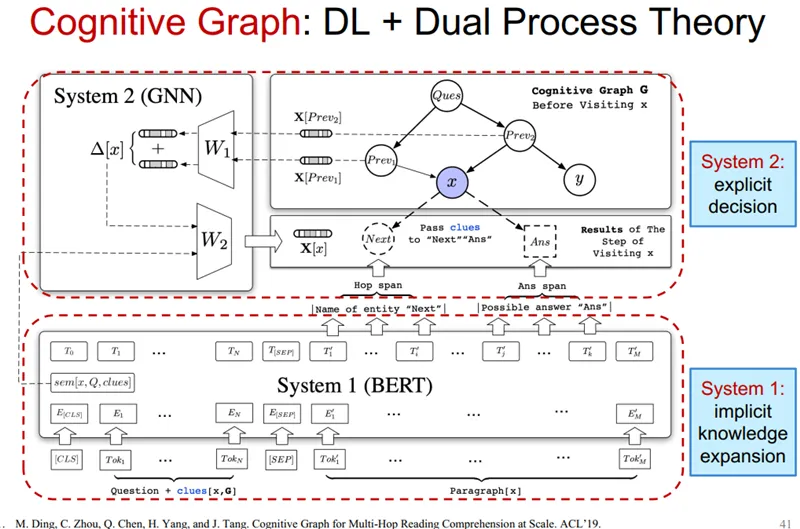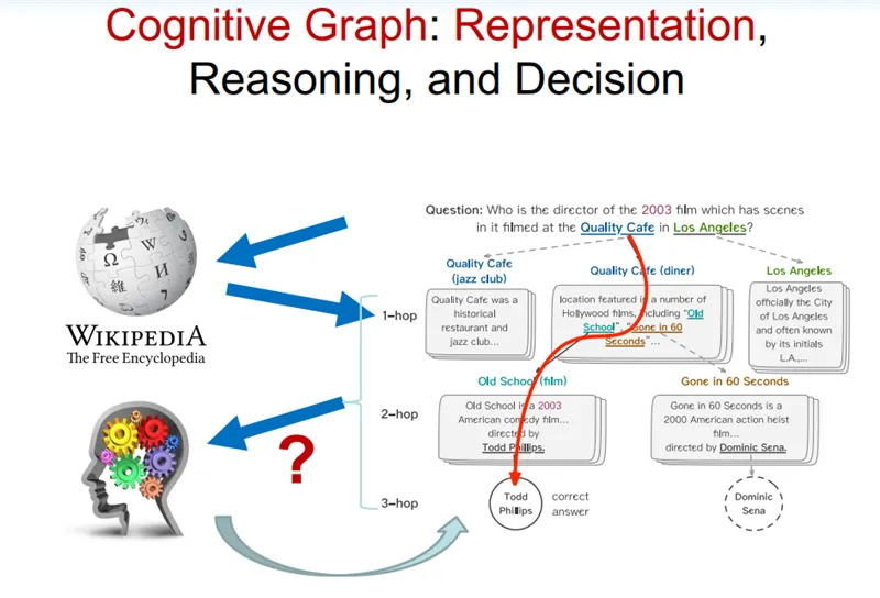 这里,我想引用张钹院士提出来的第三代人工智能的理论体系。2015 年,张钹院士提出第三代人工智能体系的雏形。2017 年,DARPA 发起 XAI 项目,核心思想是从可解释的机器学习系统、人机交互技术以及可解释的心理学理论三个方面,全面开展可解释性 AI 系统的研究。2018 年底,正式公开提出第三代人工智能的理论框架体系,核心思想为:建立可解释、鲁棒性的人工智能理论和方法。发展安全、可靠、可信及可扩展的人工智能技术。推动人工智能创新应用。其中具体实施的路线图如下:与脑科学融合,发展脑启发的人工智能理论。数据与知识融合的人工智能理论与方法。在这个思想框架下,我们做了一定的深入研究,我们称之为认知图谱。其核心概念是知识图谱+认知推理+逻辑表达。知识图谱大家很熟悉,是谷歌在 2012 年提出来的。这其中有两个重磅的图灵奖获得者:一个是爱德华·费根鲍姆(1994 年图灵奖得主),他在 20 世界 60 年代就提出来了知识库的一些理论体系和框架;另一个是 1994 年蒂姆·伯纳斯·李(2016 年图灵奖得主、WWW 的创始人、语义网络的创始人)。这里面除了知识工程、专家系统,还有一个代表性的系统 CYC,CYC 可以说是历史上持续时间最长的项目,从 1985 年开始,这个项目直到现在还一直在持续。相信很多人对认知图谱都比较陌生,这里我们举一个例子来说明一下。假如我们要解决一个问题“找到一个 2003 年在洛杉矶的 Quality 咖啡馆拍过电影的导演(Who is the director of the 2003 film which has scenes in it filmed at The Quality Cafe in Los Angeles)”。如果是人来解决这个问题的话,可能是先追溯相关的文档,如 Quality 咖啡馆的介绍文档,洛杉矶的维基百科页面等,我们可能会从中找到相关的电影,如 Old School ,在这个电影的介绍文档里面,我们可能会进一步找到该电影的导演 Todd Phillips,经过比对电影的拍摄时间是 2003 年,最终确定答案是 Todd Phillips,具体流程如下图所示:当我们用传统算法(如 BIDAF, BERT, XLNet)进行解决的时候,计算机可能只会找到局部的片段,仍然缺乏一个在知识层面上的推理能力,这是计算机很欠缺的。人在这方面具有优势,而计算机缺乏类似的能力。人在解决上述问题的过程中存在推理路径、推理节点,并且能理解整个过程,而 AI 系统,特别是在当下的 AI 系统中,深度学习算法将大部分这类问题都看作是一个黑盒子,如下图所示:这个基本的思想是结合认知科学中的双通道理论。在人脑的认知系统中存在两个系统:System 1 和 System 2,如下图所示。System 1 是一个直觉系统,它可以通过人对相关信息的一个直觉匹配寻找答案,它是非常快速、简单的;而 System 2 是一个分析系统,它通过一定的推理、逻辑找到答案。在去年的 NIPS 上,图灵奖获得者 Bengio 在大会主旨报告的 Keynote 也提到,System 1 到 System 2 的认知是深度学习未来发展的重要的方向,如下图所示:因此,我们大概用这个思路构建了这个新的、我们称为认知图谱的这样一个方法。在 System 1 中我们主要做知识的扩展,在 System 2 中我们做逻辑推理和决策,如下图所示:可以看到,我们在 System 1 中做知识的扩展,比如说针对前面的问题,我们首先找到相关的影片,然后用 System 2 来做决策。如果是标准答案,就结束整个推理的过程。如果不是标准答案,而相应的信息又有用,我们就把它作为一个有用信息提供给 System 1,System 1 继续做知识的扩展,System 2 再来做决策,直到最终找到答案。现在,在这两个系统中,System 1 是一个直觉系统,我们用 BERT 来实现,实现了以后,我们就可以做相关的信息的匹配;System 2 就用一个图卷积网络来实现,在图卷积网络中可以做一定的推理和决策。通过这个思路,我们就可以实现一定的推理+决策。这是一个总体的思路,要真正实现知识和推理,其实还需要万亿级的常识知识库的支持,如下图所示。也就是说,四五十年前费根鲍姆做过的事情,也许我们现在要重做一遍,但是我们要做到更大规模的常识知识图谱,并且用这样的方法,用这样的常识知识图谱来支撑上面的深度学习的计算,这样才能真正实现未来的 AI。所以说,这一代人工智能浪潮也许到终点还是没有推理能力,没有可解释能力。而下一波人工智能浪潮的兴起,就是实现具有推理、具有可解释性、具有认知的人工智能,我们认为这是 AI 下一个 10 年要发展、也一定会发展的一个重要方向。智东西认为,唐杰是我国清华大学计算机科学与技术系教授,他的这份报告也代表了学术界对人工智能未来发展趋势的权威预测,即人工智能经历几波浪潮之后,在过去十年中基本实现了感知能力,但却无法做到认知能力(推理、可解释等);因此在下一波人工智能浪潮兴起时,将主要会去实现具有推理、具有可解释性、具有认知的人工智能。他提出,认知智能是 AI下一个10 年要发展、也一定会发展的重要方向。