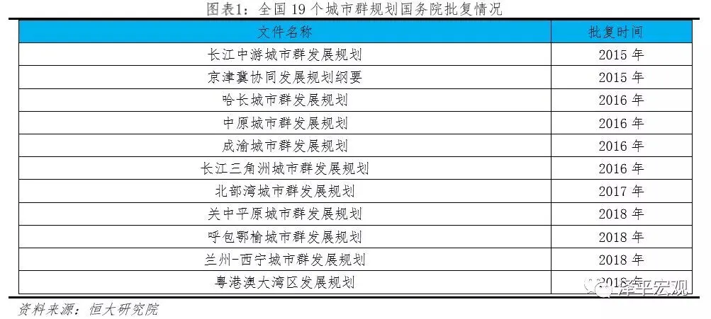 2006年“城市群”第一次出现在中央文件,2013年以来中央要求把城市群作为推进国家新型城镇化的主体形态。2006年国家“十一五”规划提出,把城市群作为推进城镇化的主体形态。2007年十七大报告指出,以大城市为依托,形成辐射作用大的城市群,培育新的经济增长极。2012年十八大报告指出,继续实施区域发展总体战略,科学规划城市群规模和布局。2013年中央城镇化工作会议提出,要在中西部和东北有条件的地区,依靠市场力量和国家规划引导,逐步发展形成若干城市群。2014年《国家新型城镇化规划(2014-2020年)》及“十三五”规划要求建设长三角、珠三角、京津冀、山东半岛、海峡西岸、哈长、辽中南、中原、长江中游、成渝、关中平原、北部湾、山西中部、呼包鄂榆、黔中、滇中、兰州-西宁、宁夏沿黄、天山北坡等19个城市群。2017年十九大报告指出,以城市群为主体构建大中小城市和小城镇协调发展的城镇格局。2018年中共中央国务院《关于建立更加有效的区域协调发展新机制的意见》明确指出,以京津冀城市群、长三角城市群、粤港澳大湾区、成渝城市群、长江中游城市群、中原城市群、关中平原城市群等城市群推动国家重大区域战略融合发展,建立以中心城市引领城市群发展、城市群带动区域发展新模式,推动区域板块之间融合互动发展。2015年至今,国务院已批复11个城市群规划。