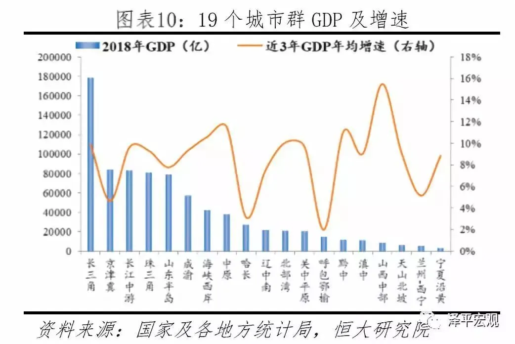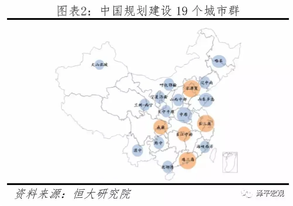 19个城市群以25%土地集聚75%人口,创造88%GDP,其中城镇人口占比78%。目前大部分城市群依旧需要进一步的发展和培育。城市群更具生产效率,更节约土地、能源等,是支撑中国经济高质量发展的主要平台,是中国当前以及未来发展的重点。根据恒大研究院2019年4月报告《中国城市发展潜力排名:2019》,发展潜力百强城市中有96个位于19大城市群。19个城市群土地面积合计约240万平方公里,占全国的1/4。1982-2018年,19个城市群常住人口从7.1亿增至10.5亿,人口占比从70.3%增至75.3%。2018年城镇化率达到61.7%,即城镇人口6.5亿,占全国城镇人口的78.3%;GDP合计79.3万亿,占全国的88.1%。长三角、京津冀、成渝、长江中游、山东半岛五个城市群人口过亿,分别为1.5亿、1.1亿、1.0亿、1.3亿、1.0亿。中原、珠三角、海峡西岸、哈长、北部湾、关中平原六个城市群人口均在4000-7000万之间,辽中南、黔中、滇中三个城市群人口在2000-4000万,而山西中部、兰州-西宁、呼包鄂榆三个城市群人口在1000-2000万,宁夏沿黄、天山北坡城市群不到700万。目前大部分城市群建设尚不成熟。一方面,多数城市群中心城市尚处于集聚阶段,对周边中小城市的辐射带动作用不强;另一方面,城市群内的各城市之间由于利益因素互相博弈,协调机制不健全,城市群之间也存在同质化竞争、资源错配等问题。