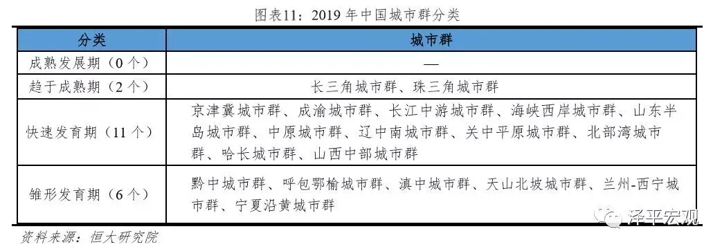 长三角和珠三角城市群进入趋于成熟期,京津冀、成渝、长江中游、海峡西岸等11个城市群处于快速发育期,黔中、呼包鄂榆、滇中等6个城市群处于雏形发育期。中国暂时没有城市群达到成熟发展期水平。趋于成熟期城市群2018年GDP在5万亿以上,A+H股上市公司数在190家以上,年发明专利授权量在1.6万件以上,城市群分工体系逐渐形成、基础设施处于快速建设期。快速发育期城市群2018年GDP多在1万亿以上,但多数城市群的中心城市尚处于虹吸阶段,中心城市与几乎所有周边城市的人均GDP差距都在扩大。雏形发育期城市群2018年GDP大都在1万亿元以下,产业创新指标也在城市群排名相对靠后。根据上述标准,长三角和珠三角城市群进入趋于成熟期,京津冀、成渝、长江中游、海峡西岸等11个城市群处于快速发育期,黔中、呼包鄂榆、滇中等6个城市群处于雏形发育期。