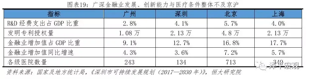 除深圳外,珠三角城市主要以中低端制造业为主,自主创新能力有待提高,优质公共资源短缺。第一,珠三角城市大都以中低端制造业为主。珠三角城市群产业发展得益于20世纪80年代初和90年代初国际上的两次产业大转移,均以劳动密集型为主,产业结构趋同。除深圳外,其余城市的当前支柱产业仍集中于机械制造、金属冶炼、纺织、食品、化工等中低端制造业,金融、信息、新能源、新材料等产业发展缓慢。以金融业为例,2018年广州、深圳金融业增加值占GDP比值分别为12.7%、9.1%,而北京、上海达16.8%、17.7%;从增速看,北京金融业增加值同比增速为7.2%,上海为5.7%,广州、深圳分别仅为4.3%、3.7%。第二,珠三角城市群与长三角、京津冀城市群相比,核心城市的自主创新能力仍待提高。2018年广州、深圳R&D经费支出占GDP的比值分别为2.8%、4.0%,而北京、上海已经分别达到5.7%、4.1%。2018年广州、深圳发明专利授权量为1.1万件、2.1万件,低于北京、上海的4.8万件、2.13万件。第三,优质公共服务资源短缺已成为制约珠三角城市群发展的瓶颈。教育方面,珠三角城市群仅有中山大学、华南理工大学等4所985和211高校,而京津冀、长三角城市群均超过20所;医疗方面,广州、深圳各级各类医院数量分别为243家、134家,远低于北京、上海的713、349家。