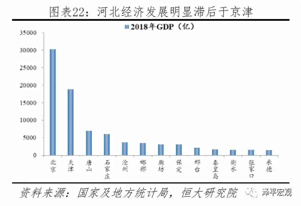 京津冀城市群城镇规模等级不合理,发展不平衡明显。第一,以城区常住人口计算,2017年京津冀城市群共有1000万以上的超大城市1个(北京)、500万以上1000万以下的特大城市1个(天津)、300万以上500万以下的I型大城市2个(石家庄、唐山)、100万以上300万以下的II型大城市4个(保定、张家口、秦皇岛、邯郸)、50万以上100万以下的中等城市5个(廊坊、承德、沧州、邢台、衡水),城镇规模等级呈现出明显的两极分化特征。第二,北京、天津实力明显高于其他城市,表现出更强的集聚能力,成为人才和创新高地,河北发展滞后,辐射带动能力弱。从GDP看,北京2018年GDP超3万亿,天津超1.8万亿,而其余城市均低于8千亿;从上市公司看,2017年北京有459个A+H股上市公司,天津有62个,其余城市合计仅71个;从公共资源看,北京每千人执业(助理医师)4.4人,天津市和河北省均低于3人,北京985+211合计35所,天津3所,河北仅1所;从高铁日均班次看,2018年北京高铁日均班次为735趟,天津为744趟,其余城市皆低于500趟。