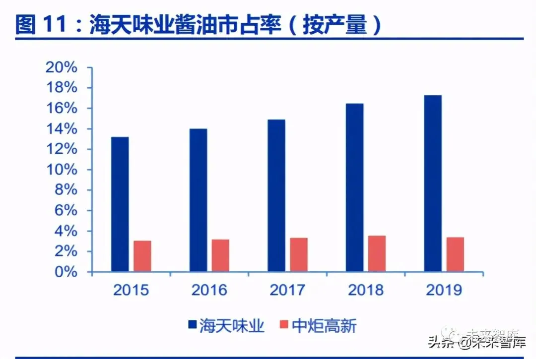 虽然集中度不高,但强者恒强、向头部集中的趋势已在近几年显露。以酱油为例,2016 年至 2019 年,龙头企业海天味业与中炬高新(美味鲜)的酱油产量增速普遍稳定在双位数 以上,而行业整体产量的增速约为 5%。我们认为,在传统调味品赛道上,龙头企业已构筑 渠道、品牌的护城河,领先优势将不断强化巩固,叠加头部企业通过扩品类切入更多细分 赛道,中小企业的生存空间被持续挤压,行业出清有望得到加速。