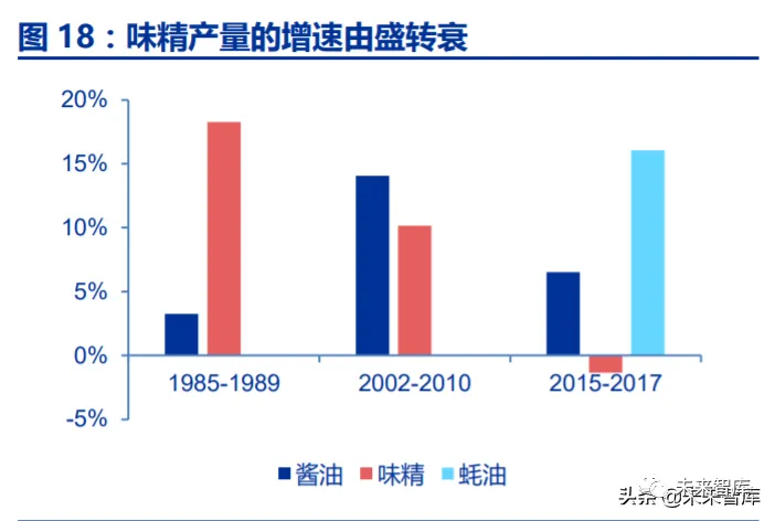 功能细分,品类替代。在产品端,酱油行业掀起功能细分浪潮,其中高鲜酱油的出现 为味精的衰退埋下伏笔。80 年代,味精产量高速增长,整体增速高于同期酱油。90 年代末, 以太太乐为代表的鸡精鸡粉产品在行业内兴起,味精产量增速开始放缓。00 年代末 10 年 代初,海天味业开发了自己的味极鲜酱油,历经多年培育实现全国推广,导致味精在近 10 年内被不断替代。味精的角色逐步沦为上游食品加工的原材料,出现在其他调味品中,譬 如市场上的主流鸡精鸡粉、蚝油与高鲜酱油均包含味精(谷氨酸钠)的身影。